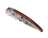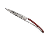 Couteau ultra léger en acier inoxydable 420, finition mate. Lame avec cran de sécurité de type liner lock décorée d'une fine gravure au laser. Clip de ceinture. Le manche est orné d'une plaquette en bois corail massif. Le bois corail (ou Padouk) est une essence de bois abondante utilisée de longue date en coutellerie pour ses précieux reflets rouges / ambrés (d'où il tire son nom), sa robustesse et son excellente résistance à l'humidité. Il souligne ici merveilleusement l'élégance d'un couteau Deejo.