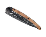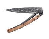 Couteau ultra léger en acier inoxydable Z40C13, finition titane noir. Lame avec cran de sécurité de type 'liner lock' décoré d'une fine gravure au laser. Clip de ceinture. Le manche est orné d'une plaquette en loupe de genévrier.Le genévrier est un bois naturellement odorant, dont se dégage un parfum légèrement poivré. Tout en arabesque de beiges, chaque plaquette, finement nervurée, fait de votre Deejo une pièce unique et précieuse.