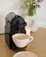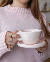 Jolie tasse et soucoupe de couleur rose pâle avec de délicates fleurs blanches.