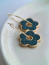 Pendentif: pendentif en forme de fleur fait à la main en argile polymère, couleur ivoire, bleu royal, sarcelle OU noir et motif Fleurs de cerisier environ 2.1 x 2.1 cm sur base et contour plaqué or 18k ou laiton.