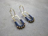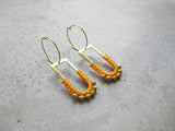 Boucles d'oreilles dorées de type anneaux avec breloque en demi-lune présentant un détail de fibre réalisé un tout petit noeud à la fois par la technique du micro-macramé.