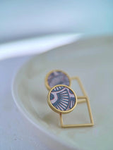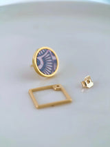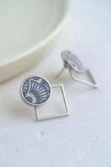 BOUCLE d'oreille EAR JACKET, clou cercle plaqué or pièce en liège (couleur sarcelle et beige), motif Art Déco et derrière d'oreille carré or.