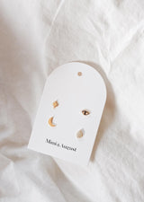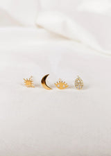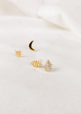 L'oeil, l'étoile et la lune sont en acier inoxydable plaqué or. La boucle d'oreille en forme de larme est en cuivre plaqué or avec une tige en acier inoxydable. Très léger et peut être porté toute la journée !