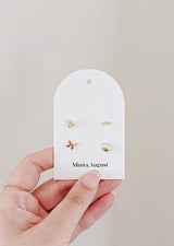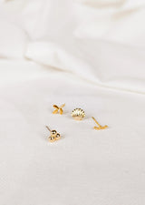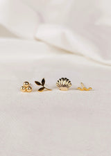 La vague et la feuille sont en acier inoxydable plaqué Or. Le coquillage et la perle sont en cuivre plaqué Or avec tige en acier inoxydable