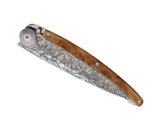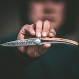 Couteau ultra léger en acier inoxydable Z40C13, finition mat. Lame avec cran de sécurité de type 'liner lock' décorée d'une fine gravure au laser. Clip de ceinture. Le manche est orné d'une plaquette en loupe de genévrier.Le genévrier est un bois naturellement odorant, dont se dégage un parfum légèrement poivré. Tout en arabesque de beiges, chaque plaquette, finement nervurée, fait de votre Deejo une pièce unique et précieuse.
