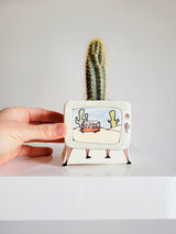 Cache-pot TV vintage vert en céramique. Vieux télévieur avec image de cactus et Westfalia orange. Vase unique en porcelaine. Joyeux item de décoration.