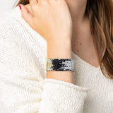 Cet accessoire tendance incarne la modernité avec son design ombré fascinant qui passe progressivement d'une couleur profonde à des nuances dorées et argentées métalliques. Ajoutez une touche chic à votre look en toute simplicité avec ce bracelet raffiné.