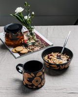 Myth réinvente la narration symbolique avec des formes simplifiées d'oiseaux et de feuillages. Une technique spéciale de résistance à la cire rend ce bol unique, tandis que la texture nervurée et le glacis mat satiné renforcent la qualité tactile.
