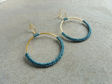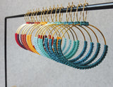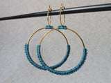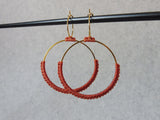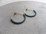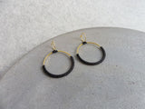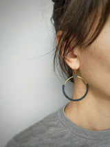 Boucles d'oreilles créoles anneaux doubles avec un détail de fibre couleur anthracite (gris foncé) réalisé minutieusement un tout petit noeud à la fois par la technique du micro-macramé.
