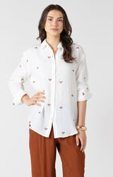 Chemise blanche texturée avec mini fleurs blanches et feuillages verts.