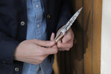 Couteau ultra léger en acier inoxydable Z40C13, finition mat. Lame avec cran de sécurité de type 'liner lock' décorée d'une fine gravure au laser. Clip de ceinture. Le manche est orné d'une plaquette en loupe de genévrier.Le genévrier est un bois naturellement odorant, dont se dégage un parfum légèrement poivré. Tout en arabesque de beiges, chaque plaquette, finement nervurée, fait de votre Deejo une pièce unique et précieuse.