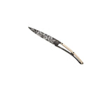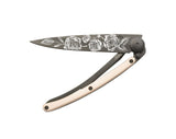 Couteau ultra léger en acier inoxydable Z40C13, finition titane noir. Lame avec cran de sécurité de type 'liner lock' décoré d'une fine gravure au laser. Clip de ceinture. Le manche est orné d’une plaquette en Zamac dorée à l’or fin. Étincelant de mille reflets dorés, l’or est une matière inaltérable, dense et noble que Deejo célèbre ici principalement pour l’admiration qu’il attise.