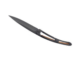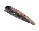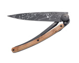 Couteau ultra léger en acier inoxydable Z40C13, finition titane noir. Lame avec cran de sécurité de type 'liner lock' décoré d'une fine gravure au laser. Clip de ceinture. Le manche est orné d'une plaquette en loupe de genévrier.Le genévrier est un bois naturellement odorant, dont se dégage un parfum légèrement poivré. Tout en arabesque de beiges, chaque plaquette, finement nervurée, fait de votre Deejo une pièce unique et précieuse.
