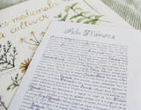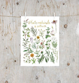 Tirage d'un dessin de l'artiste fait au crayon et à l'aquarelle. Il s'agit d'une petite affiche présentant 21 plantes médicinales faciles à faire pousser dans le jardin. Avec chaque affiche est fourni un petit 'aide-mémoire' sur papier cartonné mesurant 5,5' x 8,5' et indiquant le nom des plantes, quelques-unes de leurs propriétés médicinales et de quelles façons les utiliser.