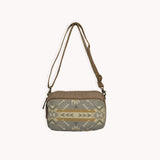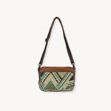 Ce sac fait main au style rétro est conçu à partir de matériaux mixtes, notamment un tapis en coton, de la toile recyclée et du cuir réutilisé — une pièce tendance et engagée.