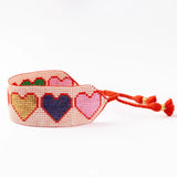Vous cherchez un bracelet plein de cœur ? Celui-ci associe un fond ivoire à des cœurs éclatants en vert, rouge, doré et bleu marine. Avec son fil rouge coquelicot contrastant et ses pompons rouges espiègles, c’est une touche de couleur joyeuse qui fait un cadeau charmant pour la Saint-Valentin ou la fête des amies.