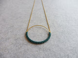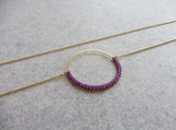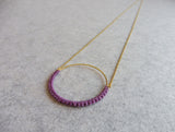 Collier pendentif en laiton avec anneau circulaire, orné d’un détail en fibre colorée au style moderne et minimaliste, réalisé selon la technique du micro-macramé — un minuscule nœud à la fois.